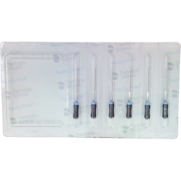 Flexo-Instrumente aus Edelstahl verfügen dank ihres dreieckigen Querschnitts über eine größere Flexibilität im Vergleich zu herkömmlichen Handinstrumenten. Die Spitze der Instrumente ist abgerundet und nicht schneidend. Bis Größe 030 auch in 18 mm lieferbar. K-Flexoreamer 21, 25 und 31 mm Ref. A 011C. Packung 6 Flexoreamer 25 mm ISO 040