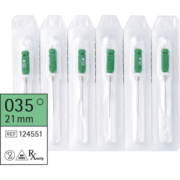 Hochwertige und ISO-konform exakt hergestellte Endo-Instrumente "Made by Sendoline". Sie haben eine sehr gute Schneidleistung und eine hohe Bruchsicherheit. Die Instrumente sind farbcodiert nach ISO-Größen und sterilisierbar bis 200 °C. Der Griff ist durch die ergonomische Grippfläche rutschfest und das Instrument damit sicher zu verwenden. In einer Blisterpackung, die eine hygienische Einzelentnahme gewährleistet, befinden sich 6 Instrumente, die mit einem Silikonstopper ausgestattet sind. Es handelt sich um ein single use Produkt, dass vor dem Einsatz der Sterilisation bedarf. Packung 6 Feilen 21 mm ISO 035