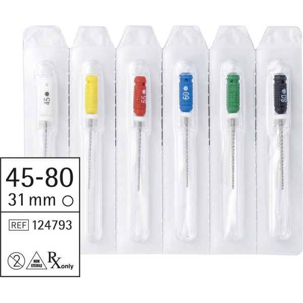 Hochwertige und ISO-konform exakt hergestellte Endo-Instrumente "Made by Sendoline". Sie haben eine sehr gute Schneidleistung und eine hohe Bruchsicherheit. Die Instrumente sind farbcodiert nach ISO-Größen und sterilisierbar bis 200 °C. Der Griff ist durch die ergonomische Grippfläche rutschfest und das Instrument damit sicher zu verwenden. In einer Blisterpackung, die eine hygienische Einzelentnahme gewährleistet, befinden sich 6 Instrumente, die mit einem Silikonstopper ausgestattet sind. Es handelt sich um ein single use Produkt, dass vor dem Einsatz der Sterilisation bedarf. Sortiment 6 Feilen 31 mm ISO 045-080