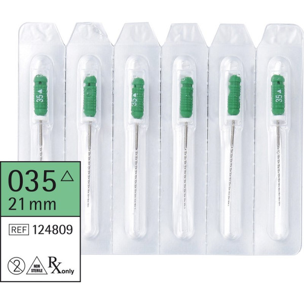 Hochwertige und ISO-konform exakt hergestellte Endo-Instrumente "Made by Sendoline". Sie haben eine sehr gute Schneidleistung und eine hohe Bruchsicherheit. Die Instrumente sind farbcodiert nach ISO-Größen und sterilisierbar bis 200 °C. Der Griff ist durch die ergonomische Grippfläche rutschfest und das Instrument damit sicher zu verwenden. In einer Blisterpackung, die eine hygienische Einzelentnahme gewährleistet, befinden sich 6 Instrumente, die mit einem Silikonstopper ausgestattet sind. Es handelt sich um ein single use Produkt, dass vor dem Einsatz der Sterilisation bedarf. Packung 6 Bohrer 21 mm ISO 035