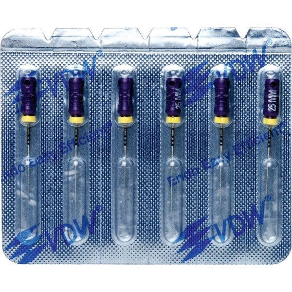 Hocheffiziente Aufbereitung in feilender Zugbewegung.Hohe SchneidleistungBruchsichere, hochflexible Stahllegierung mit hoher GefügereinheitDie inaktive Spitze führt das Instrument sicher im KanalDeutliche Kennzeichnung des Instrumententyps und der ISO Größe am GriffRöntgenopake KalibrierringeZusätzlicher Längenaufdruck am GriffMit vormontierten Silikon-Stoppern Blisterpackung 6 Feilen 25 mm ISO 010