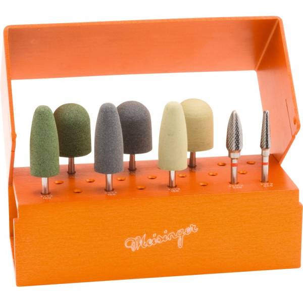 Der Prothesenkorrektursatz bietet ein umfassendes Instrumentarium für die einfache und schnelle Durchführung verschiedenster Korrekturen am Kunststoff in der Praxis. Die innovative Verzahnungsgeometrie der im Sortiment enthaltenen Hart metallfräser sichert dabei bereits beim Einsatz dieser Instrumente die Erzielung ungewöhnlich glatter Oberflächen. Die verschiedenen Kunststoffpolierer sind das Ergebnis langjähriger Entwicklungen und zeichnen sich durch außergewöhnlich hohe Leistungsfähigkeit und Haltbarkeit aus.