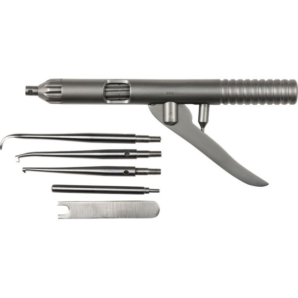 Mechanischer Kronen- und Brückenentferner. Sehr wirksam durch Impulswelle. Nur das Instrumentenende unter den Kronenrand platzieren und den "Klick" auslösen (Schlingenaufsatz optional). Schnelle, wirksame und einfache Kronen- und Brückenentfernung. Hochwertig mattierter Edelstahl, autoklavierbar. Set 3 Enden (Nr. 1, Nr. 2, Nr. 3), 1 Instrument