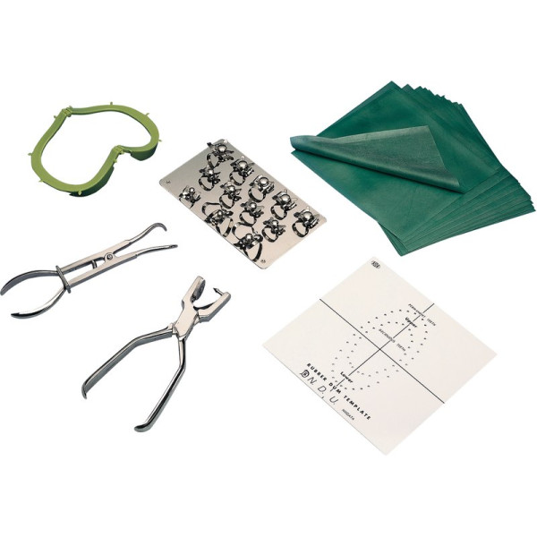 FIT (Set 2) – Starter Kit II, Bord mit 12 Klammern komplett, Klammerzange, Lochzange, Latex medium (36 Blatt), Klapprahmen, Lochschablone, Kofferdam Broschüre.