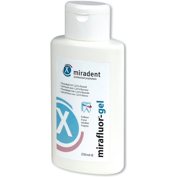 mirafluor®-gel Fluoridgel zur intensiven Kariesprophylaxe. Kariesprophylaxe mit Natriumfluorid Intensive Zahnschmelzhärtung Effektive Säureresistenz mirafluor-gel mit 1,23 % Fluorid mirafluor-k-gel mit 0,615 % Fluorid ist besonders für Kinder geeignet HV-Display mit 12 Tuben Flasche 250 ml Gel Erdbeere
