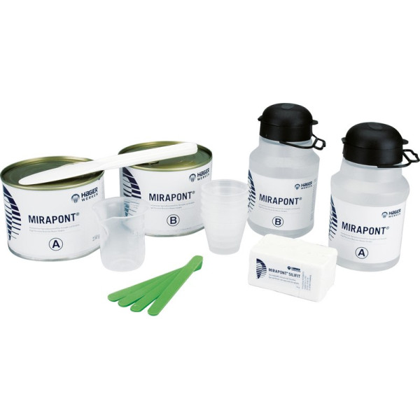 Mirapont® heller, hoch präziser Spezialkunststoff für Stümpfe und Modelle.Sehr dünn und leicht fließendes MaterialBeide Flüssigkeiten (Komponenten A und B, Mischungsverhältnis 1:1) sind in 30 Sekunden angerührtZum Abformen aus Silikon, Alginat, reversiblem Hydrokolloid und ThermoplastNach 90 Minuten wird entfernt, gesägt, beschliffenTotalaushärtung: 2 Stunden, mittel - 70 SHD Dose 250 g Komponente A