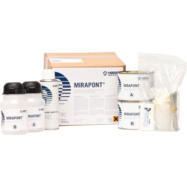 Mirapont® heller, hoch präziser Spezialkunststoff für Stümpfe und Modelle.Sehr dünn und leicht fließendes MaterialBeide Flüssigkeiten (Komponenten A und B, Mischungsverhältnis 1:1) sind in 30 Sekunden angerührtZum Abformen aus Silikon, Alginat, reversiblem Hydrokolloid und ThermoplastNach 90 Minuten wird entfernt, gesägt, beschliffenTotalaushärtung: 2 Stunden, mittel - 70 SHD Set 250 g Dose A, 250 g Dose B, 2 Dosierflaschen (A, B), 200 ml Agent Plus, 100 g Silifit, 5 Messbecher, 1 Anmischbecher mit Gießtülle, 2 große Anmischspatel, 5 kleine Anmischspatel, Einmalhandschuhe