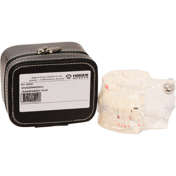 Hochwertiges transparentes Anschauungsmodell. Alle 32 Zähne können aus der Alveole entnommen werden.Gut sichtbarer anatomischer WurzelverlaufGefertigt aus durchsichtigem, robustem KunststoffIm Maßstab 1:1 gefertigtPlusHochwertiges, transparentes Anschauungsmodell mit ZahnkrankheitenOK und UK zeigen verschiedene Darstellungen über Krankheitsverläufe kariöser DefekteMehrere Beispiele entzündlicher WurzelprozesseDarstellung einer Implantatarbeit mit AufbauKomplette OK- und UK-Bezahnung in einem Klipp-Klapp ArtikulatorModell im Maßstab 1:1, die einzelnen Zähne sind nicht entnehmbarDe Luxzusätzliche BeispieleOK und UK zeigen verschiedene Darstellungen über Zahndefekte, Krankheitsverläufe kariöser Defekte und Fehlstellungen der WeisheitszähneKindzusätzliche BeispieleSehr klare Darstellung von Milchzähnen und bleibenden ZähnenUK und OK mit zwölf Milchzähnen mit Zahnerkrankungen, Interproximal- und Molarkaries, abgebrochenem vorderem Milchzahn mit Wurzelerkrankung Stück Studienmodell Plus