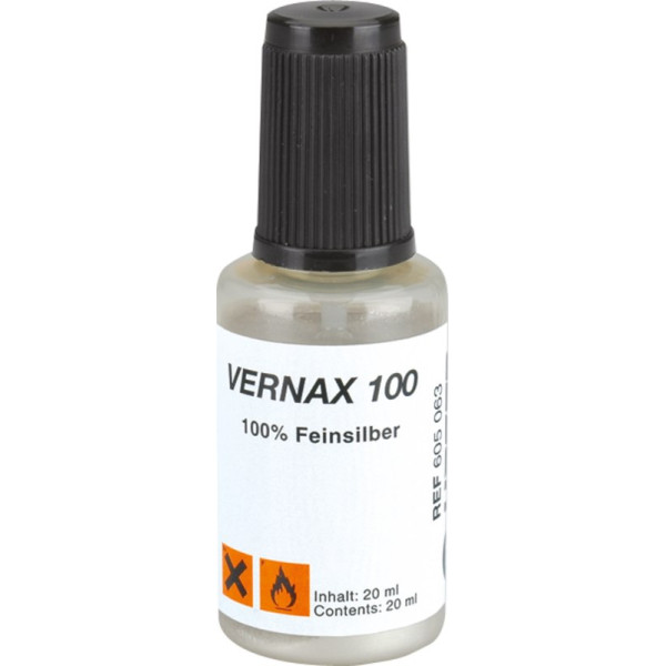 VERNAX® 100, Distanzlack für Stümpfe, 100% Feinsilber von genau normierter Korngröße. Gleichmäßiger Film von 8-10 Micron, unlöslich gegen alle Isoliermittel und gegen Abdampfen. Hitzefest beim Tiefziehen und Tauchwachsen, schnelltrocknend. Mit Aceton sauber zu entfernen. Wird zur Verarbeitung von z. B. Empress empfohlen. Flasche 20 ml Distanzlack