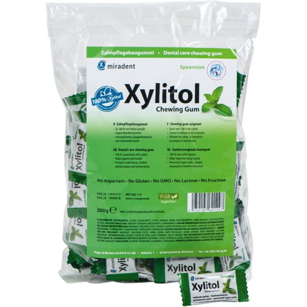 Zahnpflegekaugummi Xylitol Chewing Gum.Zu 100% mit Xylitol gesüßtOhne Aspartam, Sorbitol, Laktose und GlutenGegen MundtrockenheitKariespräventiv, plaquehemmendVerkaufsförderndes HV-Display aus Acryl auf AnfrageAufrechterhaltung der Zahnmineralisation Spearmint, Peppermint, Cinnamon - Zutaten: Süßungsmittel: Xylitol, Kaumasse, Aroma, Feuchthaltemittel: Glycerin Verdickungsmittel: Gummi Arabicum, Emulgator: Sojalecithin, Farbstoff: Titandioxid Überzugsmittel: Carnaubawachs. Fresh Fruit, Cranberry - Zutaten: Süßungsmitte: Xylitol, Kaumasse, Aroma Feuchthaltemittel: Glycerin, Verdickungsmittel: Gummi Arabicum, Säureregulator: Apfelsäure Emulgator: Sojalecithin, Farbstoff: Titandioxid Überzugsmittel: Carnaubawachs. Green Tea - Zutaten: Süßungsmitte: Xylitol, Kaumasse, Aroma, Feuchthaltemittel: Glycerin, Verdickungsmittel: Gummi Arabicum, Pflanzenextrakt (Grüner Tee) Emulgator: Sojalecithin Farbstoff: Titandioxid, Überzugsmittel: Carnaubawachs Hinweis: Kaugummis mit Süßungsmittel. Kann bei übermässigem Verzehr abführend wirken. Packung 100 x 2 Kaugummis Minze