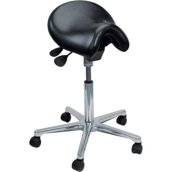 Ergotherapeutischer Spezialsitz. Einzigartige, patentierte Sattelform entspannt Lenden- und Rückenbereich. Mindert signifikant den Bandscheibendruck und reduziert Spannungsschmerzen. Erhält beim Sitzen die natürliche Becken- und Wirbelsäulenposition. Dank Neigungsverstellung der Sitzfläche: aufrechte Beckenposition und gerader Rücken auch in der Arbeitshaltung am Patienten. Sitzfläche aus Echtleder. Stück Sattelsitz schwarz, ohne Rückenlehne
