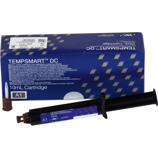 Dualhärtendes Material für provisorische Kronen & Brücken Schnell und effizient zur finalen Restauration Seine Kompetenz und Erfahrung im Bereich der provisorischen Materialien hat GC bereits seit langem mit der äußerst erfolgreichen Unifast Produktreihe unter Beweis gestellt. GC ist stolz darauf, eine echte Weiterentwicklung präsentieren zu können, die im Bereich der temporären Kronen und Brücken etwas völlig Neues bietet. Mit TEMPSMART DC führt GC eine neue Technologie ein, durch die Sie das erste dualhärtende und weichmacherfreie Material nutzen können. Stück 10 ml Kartusche A1