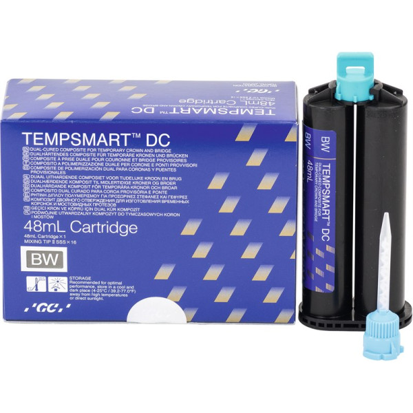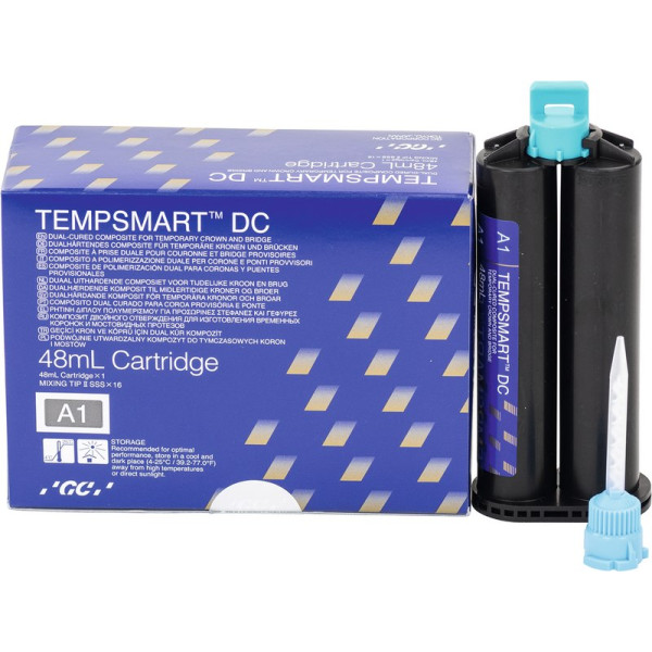 Dualhärtendes Material für provisorische Kronen & Brücken Schnell und effizient zur finalen Restauration Seine Kompetenz und Erfahrung im Bereich der provisorischen Materialien hat GC bereits seit langem mit der äußerst erfolgreichen Unifast Produktreihe unter Beweis gestellt. GC ist stolz darauf, eine echte Weiterentwicklung präsentieren zu können, die im Bereich der temporären Kronen und Brücken etwas völlig Neues bietet. Mit TEMPSMART DC führt GC eine neue Technologie ein, durch die Sie das erste dualhärtende und weichmacherfreie Material nutzen können. Stück 10 ml Kartusche A2