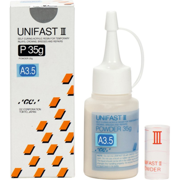 GC UNIFAST III ist ein selbsthärtender Acrylkunststoff für provisorische Inlays, Kronen, Brücken und Restaurationen. GC UNIFAST III - führt die SURF-Technologie (Surface Uniformity Revolutionary Fixation Technology), eine neue und revolutionäre Polymerverarbeitungstechnologie ein. Die Handhabung, die physikalischen Eigenschaften und die Ästhetik haben eine Klasse erreicht, die alle Erwartungen an Pulver-/Flüssigkeits-Kunststoffen weit übertreffen. GC UNIFAST III wird wie GC Pattern Resin in der Pinseltechnik verarbeitet. Kombination: Optiglaze. Nachfüllpackung 35 g Pulver A3,5