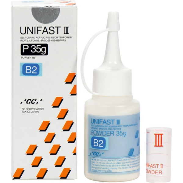 GC UNIFAST III ist ein selbsthärtender Acrylkunststoff für provisorische Inlays, Kronen, Brücken und Restaurationen. GC UNIFAST III - führt die SURF-Technologie (Surface Uniformity Revolutionary Fixation Technology), eine neue und revolutionäre Polymerverarbeitungstechnologie ein. Die Handhabung, die physikalischen Eigenschaften und die Ästhetik haben eine Klasse erreicht, die alle Erwartungen an Pulver-/Flüssigkeits-Kunststoffen weit übertreffen. GC UNIFAST III wird wie GC Pattern Resin in der Pinseltechnik verarbeitet. Kombination: Optiglaze. Nachfüllpackung 35 g Pulver B2