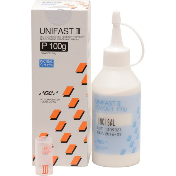GC UNIFAST III ist ein selbsthärtender Acrylkunststoff für provisorische Inlays, Kronen, Brücken und Restaurationen. GC UNIFAST III - führt die SURF-Technologie (Surface Uniformity Revolutionary Fixation Technology), eine neue und revolutionäre Polymerverarbeitungstechnologie ein. Die Handhabung, die physikalischen Eigenschaften und die Ästhetik haben eine Klasse erreicht, die alle Erwartungen an Pulver-/Flüssigkeits-Kunststoffen weit übertreffen. GC UNIFAST III wird wie GC Pattern Resin in der Pinseltechnik verarbeitet. Kombination: Optiglaze. Nachfüllpackung 100 g Pulver incisal