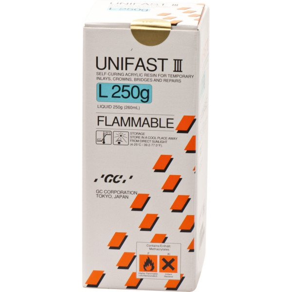 GC UNIFAST III ist ein selbsthärtender Acrylkunststoff für provisorische Inlays, Kronen, Brücken und Restaurationen. GC UNIFAST III - führt die SURF-Technologie (Surface Uniformity Revolutionary Fixation Technology), eine neue und revolutionäre Polymerverarbeitungstechnologie ein. Die Handhabung, die physikalischen Eigenschaften und die Ästhetik haben eine Klasse erreicht, die alle Erwartungen an Pulver-/Flüssigkeits-Kunststoffen weit übertreffen. GC UNIFAST III wird wie GC Pattern Resin in der Pinseltechnik verarbeitet. Kombination: Optiglaze. Nachfüllpackung 260 ml Flüssigkeit