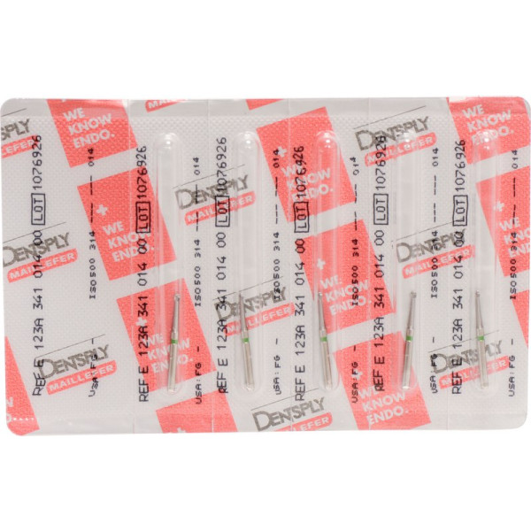 Speziell entwickelte Schneidengeometrie (großer Schneidewinkel). Hohe Leistung und effektive Entfernung der Späne. Unterstützt das Tastempfinden beim Kontakt mit gesundem Dentin. Taktile Unterscheidung zwischen gesundem und kariösem Dentin. Reduzierter Hals. Bessere Sicht. Packung 5 Bohrer FG123A014