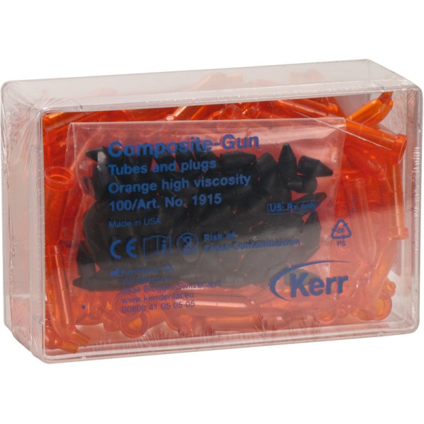 Die vielseitig anwendbare Pistole für blasenfreie Applikation von Füllungs- und Befestigungsmaterialien. Die verschiedenen Spitzen zur Composite-Gun bieten ein breites Spektrum an Einsatzmöglichkeiten wie z. B. die Applikation von Füllungsmaterialien, Liners, Befestigungszementen usw. Die Vorabfüllung der Materialien in die Spitzen (lichthärtende Materialien in die orangen Spitzen) und deren Kennzeichnung durch die farbigen Kappen ergibt eine Zeitersparnis während der Behandlung. 35883 für alle chemischhärtenden Materialien. 35884 orange low viscosity für gering viskose Materialien, speziell lichthärtende Composites. 35885 orange high viscosity für viskose Materialien, speziell lichthärtende Composites. 35886 orange mit Kanüle für gering viskose Materialien, ideal für beengte Verhältnisse/Kavitäten. Nadel beliebig biegbar. 35887 grau für Großanwendungen wie Compositaufbauten, geeignet für viskose Materialien (60% mehr Spitzeninhalt, größere Öffnung). 35888 schwarz für alle lichthärtenden Materialien. 35889 Kappen für Composite-Gun-Spitzen und Kolben, in 8 verschiedenen Farben, zur Kennzeichnung vorabgefüllter Spitzen. Packung 100 Spitzen und Kolben orange high viscosity