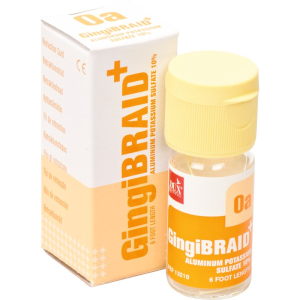 GingiBRAID+ vereinigt alle Vorteile von geflochtenen und gestrickten Fäden. Sehr gute Retraktion, GingiBRAID+ bleibt am Platz, hat nicht die Tendenz, in die Ursprungsform zurück zu gehen (memory effect). Die Fäden sind durch einen unterschiedlichen Farbstreifen leicht zu identifizieren. Geliefert wird GingiBRAID+ ungetränkt oder in Alaun getränkt. Flasche 183 cm Faden Größe 0a gelb, imprägniert