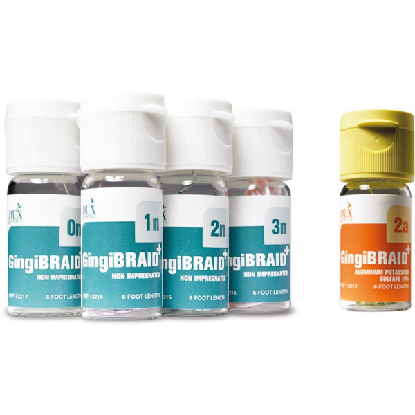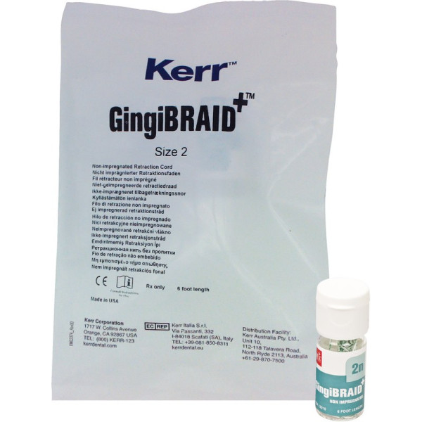 GingiBRAID+ vereinigt alle Vorteile von geflochtenen und gestrickten Fäden. Sehr gute Retraktion, GingiBRAID+ bleibt am Platz, hat nicht die Tendenz, in die Ursprungsform zurück zu gehen (memory effect). Die Fäden sind durch einen unterschiedlichen Farbstreifen leicht zu identifizieren. Geliefert wird GingiBRAID+ ungetränkt oder in Alaun getränkt. Flasche 183 cm Faden Größe 2n weiß mit grün, nicht imprägniert