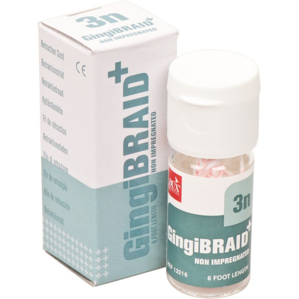 GingiBRAID+ vereinigt alle Vorteile von geflochtenen und gestrickten Fäden. Sehr gute Retraktion, GingiBRAID+ bleibt am Platz, hat nicht die Tendenz, in die Ursprungsform zurück zu gehen (memory effect). Die Fäden sind durch einen unterschiedlichen Farbstreifen leicht zu identifizieren. Geliefert wird GingiBRAID+ ungetränkt oder in Alaun getränkt. Flasche 183 cm Faden Größe 3n weiß mit rosa, nicht imprägniert