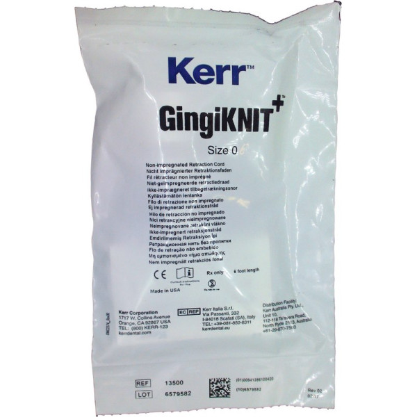 GingiKNIT+ besteht aus vielen kleinen absorbierenden Schlaufen, die in einer langen Kette mit einander verstrickt sind.Nicht imprägnierter FadenBleibt in situ, selbst wenn man den Faden mit einem Bohrer oder Diamanten touchiertLeichtes Einbringen ohne aufspleißen, auffasern und reißen. Fäden sind durch einen unterschiedlichen Farbstreifen leicht zu identifizierenFlasche mit 183 cm Faden Flasche Größe 0n