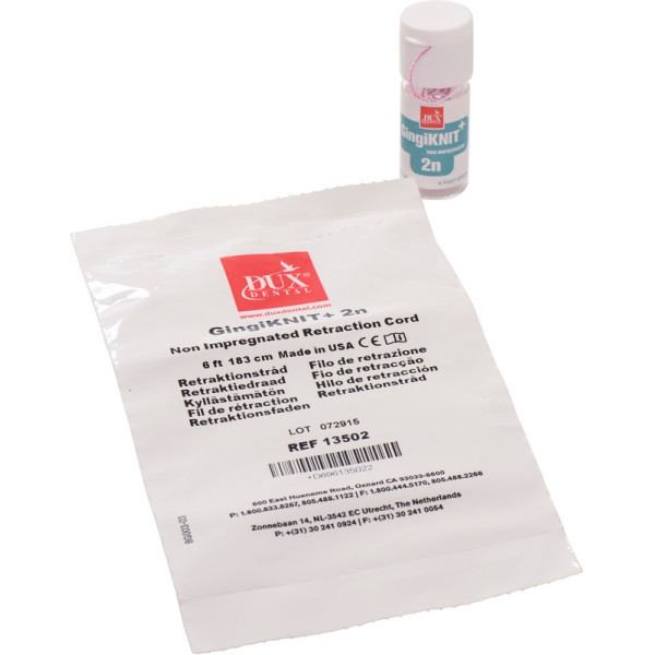 GingiKNIT+ besteht aus vielen kleinen absorbierenden Schlaufen, die in einer langen Kette mit einander verstrickt sind.Nicht imprägnierter FadenBleibt in situ, selbst wenn man den Faden mit einem Bohrer oder Diamanten touchiertLeichtes Einbringen ohne aufspleißen, auffasern und reißen. Fäden sind durch einen unterschiedlichen Farbstreifen leicht zu identifizierenFlasche mit 183 cm Faden Flasche Größe 2n