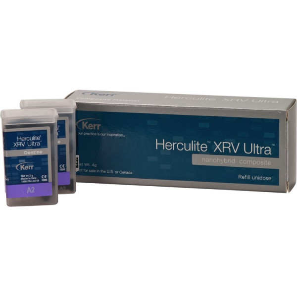 Seit mehr als 20 Jahren ist HERCULITE® XRV ein Standard im Bereich der Füllungsmaterialien. Basierend auf einer starken Marke wurde ein neues Füllungsmaterial entwickelt: HERCULITE® XRV Ultra™ Nanohybrid Komposit. Dieses innovative Komposit vereint hochmoderne Füllertechnologie mit erhöhter Ästhetik und optimierter Handhabung. Weitere überzeugende Eigenschaften sind die natürliche Opaleszenz und Fluoreszenz, erhöhte Verschleissfestigkeit, hohe Druckfestigkeit und überdurchschnittliche Bruchfestigkeit. Packung 20 x 0,2 g Unidose dentin A2