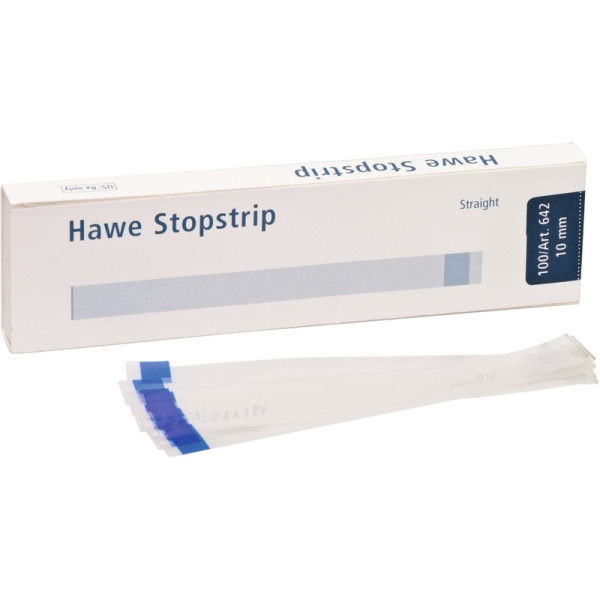 Transparente Frontzahnmatrize mit integriertem Stopstück. Der Strip wird durch einen passenden Interdentalraum in der Nachbarschaft geführt und dort mit Verstärkung verklemmt. Der Strip wird um die Präparation gelegt und das Stripende füllungsfern mit der Hand gehalten. ResultatOptimale Lichtpolymerisation0,05 mm dünn Packung 100 Strips Breite blau, 10 mm, gerade
