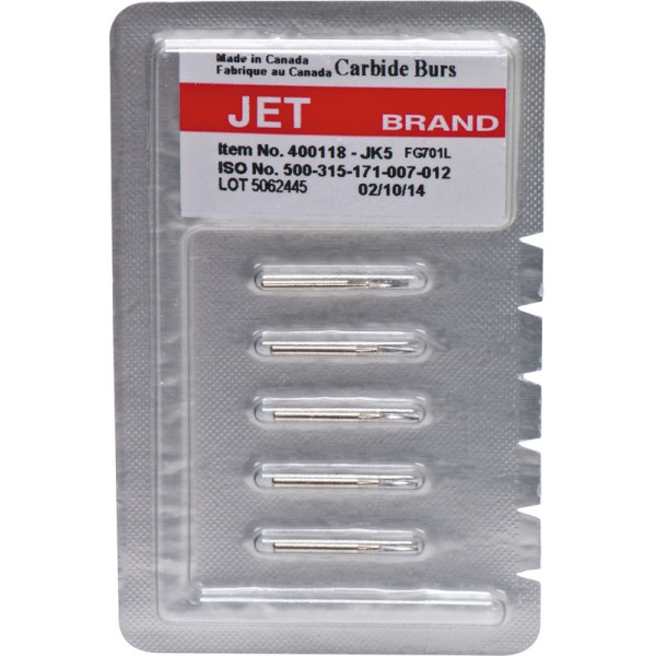 Jet Carbides™. Konisch Fissur - flaches Ende - Kreuzverzahnung.Schafft divergierende Präparationswände, ideal für indirekte Restaurationen. Querhiebe steigern Schneideleistung. Kuppelförmige Enden schaffen abgerundete innere Linienwinkel zur besseren Verteilung okklusaler Kräfte. Packung 5 Bohrer kegelförmiges, flaches Ende, Querhiebfissur, FG, Kopflänge: 4,9 mm, ISO 012