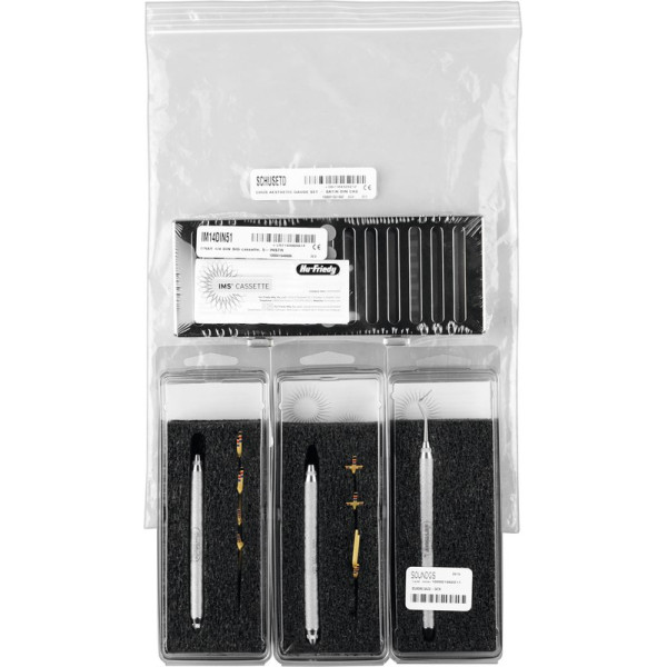 Die T-Bar-Spitze verfügt über einen vertikalen und einen horizontalen Bogen.Die Inline-Spitze verfügt über einen kurzen und langen vertikalen Bogen.Die BLPG-Spitze verfügt über vordefinierte Abmessungen.Die Papillen-Spitze hat vordefinierte Abmessungen.Die Messsonde dient der Bestimmung der Sulkustiefe sowie der Lage des mediofazialen und des interproximalen Knochenkamms.Bei den Kunststoffspitzen handelt es sich um auswechselbare Teile. Set SCHUSETD