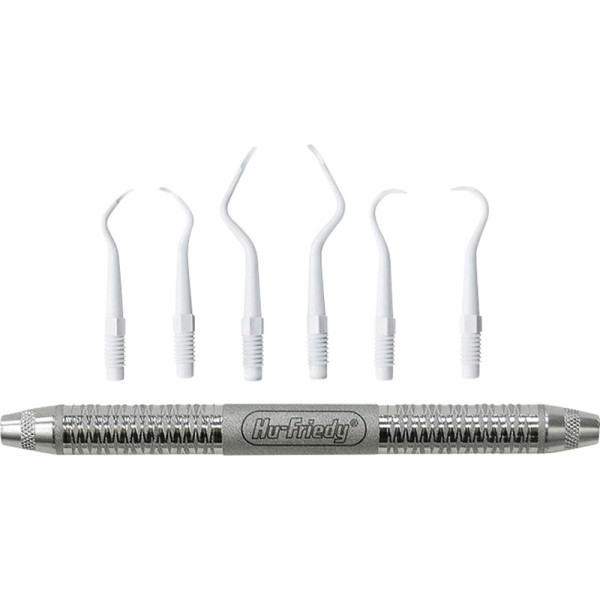 Implacare II - hart zu Ablagerungen, sanft zu Implantaten und Prothesen. Die Scaler der Reihe Implacare II, Hu-Friedy’s neuester Entwicklung zur Implantatreinigung, verfügen über eine 20% dünnere Spitze und eine neue Form zur besseren Anpassung an das Implantat. So können Implantate unter möglichst geringer Veränderung der Abutment-Oberfläche effektiv gereinigt werden. Die Einwegspitzen sind aus Plasteel gefertigt, einem hochwertigen Kunstharz, welcher Titan nicht angreift. Plasteel-Instrumente sollten vor der Verwendung im Autoklav sterilisiert werden. Der leichtgewichtige Satin Steel Griff ist ergonomisch geformt für eine optimale Balance und Kontrolle und sorgt dank Rändeldesign für einen sicheren Griff. Sortiment 3 x 4 Spitzen (4R/4L, 204S, H6/H7), Griff #6