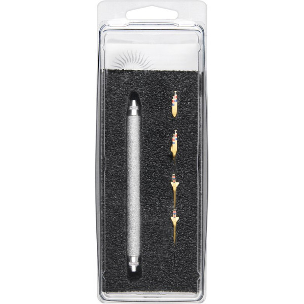 Die T-Bar-Spitze verfügt über einen vertikalen und einen horizontalen Bogen.Die Inline-Spitze verfügt über einen kurzen und langen vertikalen Bogen.Die BLPG-Spitze verfügt über vordefinierte Abmessungen.Die Papillen-Spitze hat vordefinierte Abmessungen.Die Messsonde dient der Bestimmung der Sulkustiefe sowie der Lage des mediofazialen und des interproximalen Knochenkamms.Bei den Kunststoffspitzen handelt es sich um auswechselbare Teile. Set CLGS