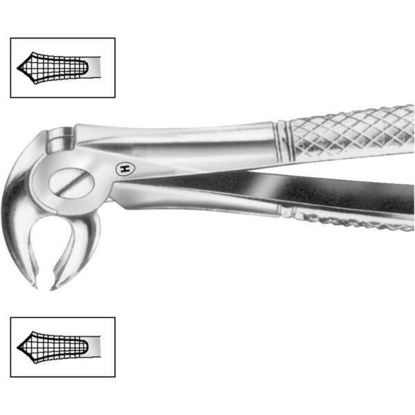 Englische Form. Top Qualität durch Made in Germany. Präzise Verarbeitung, besonders langlebig. Hervorragendes Haftprofil. Anatomische Passform. Korrosionsbeständiger, hochwertiger und rostfreier Stahl. Leichtgängig und extrem gute Handhabung durch Karogriff. Stück HSA 573-22, Figur 22, für untere Molaren, beide Seiten