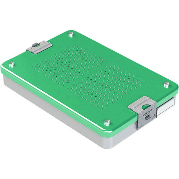 Hocheffiziente und ökologische Sterilisationsboxen! Sie sind vollständig luftdicht und entweder mit einem Papierfilter (Einmalgebrauch) oder mit einem Teflonfilter (wirksam bis zu 2000 Zyklen), einer Halterung für ein Kennzeichnungsetikett und einem Dichtungssystem ausgestattet. Die Abdeckung aus eloxiertem Aluminium ist in 7 verschiedenen Farben erhältlich: Silber, Blau, Rot, Grün, Gelb, Orange und Purple.Dieser Behälter ist geeignet für:- 1 x Kassette 28 x 18