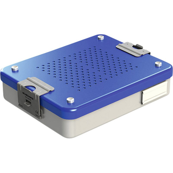 Hocheffiziente und ökologische Sterilisationsboxen! Sie sind vollständig luftdicht und entweder mit einem Papierfilter (Einmalgebrauch) oder mit einem Teflonfilter (wirksam bis zu 2000 Zyklen), einer Halterung für ein Kennzeichnungsetikett und einem Dichtungssystem ausgestattet. Die Abdeckung aus eloxiertem Aluminium ist in 7 verschiedenen Farben erhältlich: Silber, Blau, Rot, Grün, Gelb, Orange und Purple.Dieser Behälter ist geeignet für:- 1 x Kassette 18 x 14