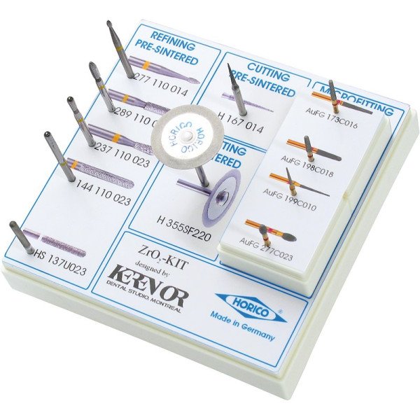 Satz zur Fein- und Nachbearbeitung von Zirkon-Keramik. Der ZrO2-Satz wurde von einem der führenden Labors für Zirkon-Keramik aus Canada entwickelt: KerenOr. Der Satz beinhaltet eine Reihe von Diamanten und Fräsern zur Glättung und Nachbearbeitung von vorgesinterten Brücken und Kronen sowie verschiedene Formen der Löwenschleifer zur Anpassung nach dem Sintern. Probieren Sie es aus! Satz ZrO2