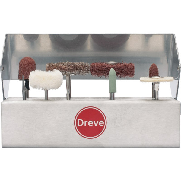 Schleifkörperset für die Aus- und Nachbearbeitung aller tiefziehtechnisch hergestellten Formteile, in einem robusten und praktischen Tischständer aus V2A. Set 1 Vierkantfräser, 1 Stichfräser, 2 Mandrelle inklusive Stützscheiben, 1 UltraTrimm medium Schleifscheibe, 1 UltraTrimm light Polierscheibe, 1 Schleifkappenträger spitz Größe 1 inklusive Schleifkappe, 1 Schleifkappenträger rund Größe 2 inklusive Schleifkappe,1 Hartgummi, 1 Flammenform, 1 Ziegenhaarbürste, 1 Baumwollschwabbel, 1 Tischständer aus V2A
