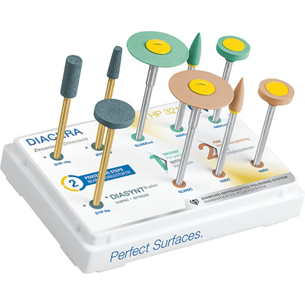 Synthetisch gebundener Diamantschleifkörper für die Bearbeitung von Keramik (Zirkonoxid, Silikatkeramik) und Metallen. Speziell bei der Bearbeitung hochfester Werkstoffe wie Zirkonoxid garantiert der DYP einen extrem hohen Abtrag bei gleichzeitig minimierter Wärmeentwichklung. Dadurch ist der DYP in seiner Anwendung sehr materialschonend (reduzierte Mikrorissgefahr). Ohne Wasserkühlung verwendbar, weicher angenehmer Schliff, hohe Kantenstabilität, kein Wärmestau in der Versorgung. Drehzahlbereich: 8.000 - 12.000 U/min. Set 9 Polierer (DYP-14g, DYP-13g, DYP-8g, SL20DCmf, H2DCmf, H8DCmf, SL20DC, H2DC, H8DC) HP 321