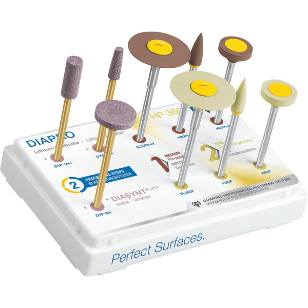 Diamantpolierer für die Bearbeitung von Zirkonoxid. Grün = 1. Stufe: Glätten und Vorpolierern Orange = 2. Stufe: Hochglanzpolitur. Herausragende Polierergebnisse durch optimierte Diamantkörnung. Niedriger Drehzahlbereich, geringe Wärmeentwicklung. Set 9 Polierer ( DYP-14, DYP-13m, DYP-8m, SL20DPmf, H2DPmf, H8DFmf, SL20DP, H8DP)