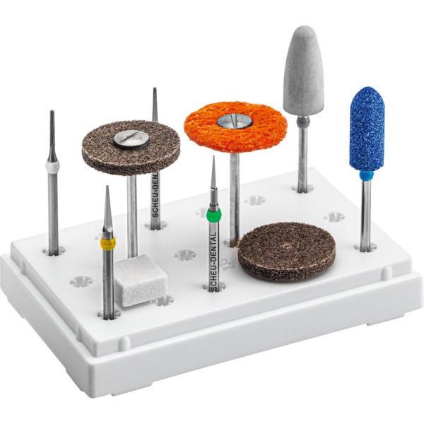 Sortiment mit acht Schleifkörpern – mit Farbcodierung zur einfachen Zuordnung – zum Trennen, Ausarbeiten und Finieren von weichelastischen und hartelastischen Folien. Set 1 Trennfräser, 1 HM-Schneidfräser, 1 HM-Tricutter fein, 1 Finierfräser, 1 BIOPERM-Trimmer, 1 POLYFIX, 1 OSAMU-Polierer, 1 DIMO PRO SLIM, 1 Zurichtstein