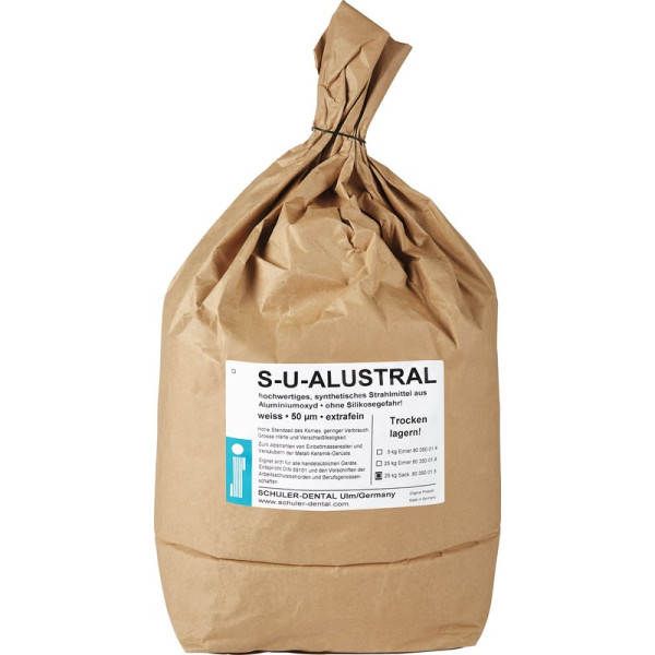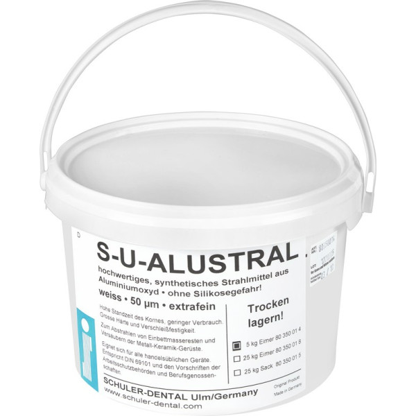 S-U-Alustral ist ein besonders reiner, weißer Edelkorund und ist nicht silikoseerzeugend. Der Anteil an Alu-Oxyd liegt bei 99,7 %. Es ist das härteste und zugleich splitterfreudigste Produkt in der Reihe der Edelkorunde, was eine stets scharfkantige Oberfläche für optimalen Abtrag bis zum entgültigen Verbrauch garantiert. Anwendungsbereich: Einbettmassen abstrahlen, Vorbehandeln von Gerüsten vor dem Aufbrennen, Entfernen überschüssiger Keramikmasse bei MK-Kronen. Eimer 5 kg