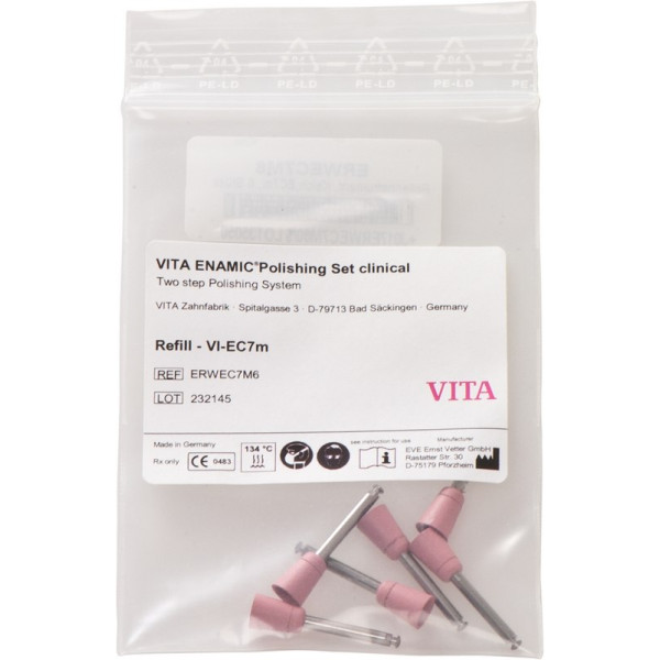 Die VITA ENAMIC® Polierkörpersets wurden für die sichere, wirtschaftliche und materialgerechte Oberflächenbearbeitung von Restaurationen aus Hybridkeramik in Praxis und Labor entwickelt. Die Sets beinhalten diverse Polierkörper zur Vor- und Hochglanzpolitur. Mit diesen Instrumenten können Kauflächen, Höcker, Fissuren und Kontaktpunkte der Restauration materialschonend poliert werden. Im Endergebnis sorgen diese Polierinstrumente für Oberflächen mit einem exzellenten Glanzgrad. Packung 6 Vorpolierer pink, Kelch, VI-EC7m
