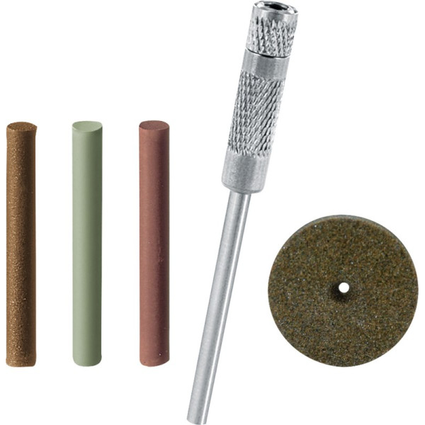 Háromlépcsős polírozó csap polírozás az okklúziós felületek. Minden fém.Tartomány Rendszeres 50 Polierstifte (barna), 2 x 25 Polierstifte (piros, zöld), 1 csavaros, 1 Abziehstein