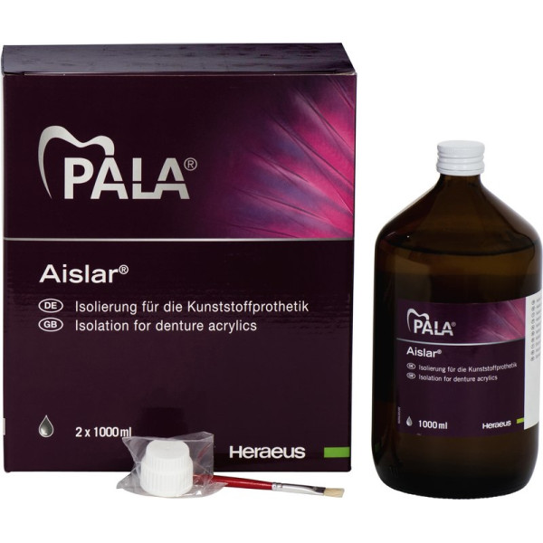 Sichere Isolierung für die Kunststoffprothetik. Eine gute Isolierung ist die Basis für eine passgenaue prothetische Versorgung. Aislar® ist eine formaldehydfreie, wässrige Lösung auf Alginatbasis zur Isolierung von Gipsoberflächen gegen Prothesenkunststoffe und Komposite. Dabei gibt es sehr vielfältige Anforderungen an eine Isolierung, wie eine schnelle Trocknungszeit, glatte Oberflächenwiedergabe und eine einwandfreie Trennung. Diese Eigenschaften werden von Aislar® sowohl bei heiß-als auch bei kaltpolymerisierenden Prothesenkunststoffen erfüllt. VorteileHöchste Passgenauigkeit der ProthesenErzielung glatter Oberflächen IndikationGips gegen KunststoffGips gegen KompositAuf allen Gipsen für Kalt- und Heißpolymerisate VerarbeitungAuf Gips (kalten/warmen)Zweimalig dünn auftragen Packung 2 x 1 Liter Flasche
