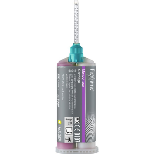 Souveräne Präzision – Jederzeit! Dieses ideal aufeinander abgestimmte kompakte Allrounder-System bietet mit seinen Varianten und dem innovativen Abbindezeit-Konzept bei flexibler Verarbeitungszeit von 1 bis 2:30 Minuten und konstanter kurzer Mundverweildauer von 2:30 Minuten die Möglichkeit, alle Abformtechniken individuell miteinander zu kombinieren. Flexitime® passt sich den Vorlieben des Behandlers an. Die beiden hydrophilen Konsistenzen auf Polyether Level, Flexitime® Light Flow und Flexitime® Medium Flow sorgen für ein ausgezeichnetes Anfließen im Sulkus und verhindern durch hohe Dehnfestigkeit das Abreißen von Fähnchen und Verzerrungen der Abformung bei der Mundentnahme. Packung 2 x 50 ml Doppelkartusche Monophase, mittelfließend, 6 Mischkanülen grün 1:1