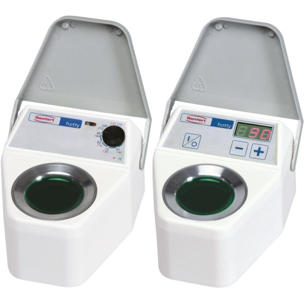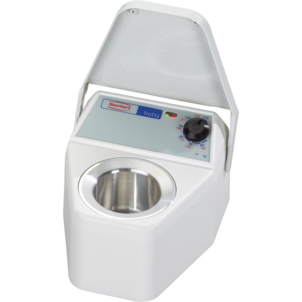 Der HOTTY 1460 wurde zum Vorteil des Zahntechnikers überarbeitet. Folgende Änderungen wurden vorgenommenWegfall des Transformators, dafür einfaches Netzkabel 230 VDer Hauptschalter auf der Folientastatur wurde ersetzt durch einen Kippschalter auf der Rückseite des GerätesÄnderungen im Farbdesign beim Gehäuse und der Bedienfolie3 Jahre Garantie Stück Wachstauchbecken Technische DatenAbmessung (B x H x T): 90 x 65 x 98 mm Gewicht: 360 g Leistungsaufnahme max.: 25 W Arbeitstemperatur max.: 110 °C