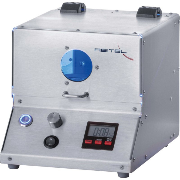 Das innovative Lichthärtegerät aus hochwertigem Edelstahl bietet drei Lichtfrequenzen für verschiedenste Materialien. Langlebige Hochleistungs-LEDs, ein großflächiger Drehteller sowie die integrierte Lüftung des Innenraums sorgen für optimale Aushärtungsbedingungen. Ideale Bedienbarkeit wird durch die individuelle Zeiteingabe am elektrischen Timer und die große Zugriffsfläche über den Klappdeckel gewährleistet. Stück Lichthärtegerät Technische DatenMaße (B x H x T):21 x 21/44 x 33,5 cm Gewicht: 5,5 kgWellenlänge: 385 – 390 nm405 – 410 nm465 – 470 nmNetzanschluss: 230 V / 50 – 60 Hz Aufnahmeleistung: 30 W Drehteller-ø: ø 12,5 cm