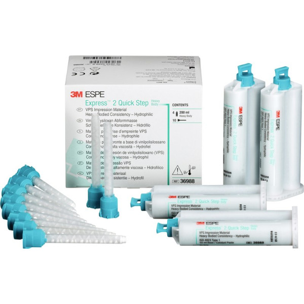 Express™ 2 ist in vielen verschiedenen Viskositäten erhältlich - von Putty bis Ultra-Light Body - für die Doppelmisch- und Korrekturtechnik. Express™ 2 bietet bestechende Präzision durch die sehr gute Balance klinisch relevanter Eigenschaften. Zum automatischen Anmischen im Pentamix Gerät. Refill Packung 2 x 300 ml Basispaste, 2 x 60 ml Katalysator, Heavy Body Quick